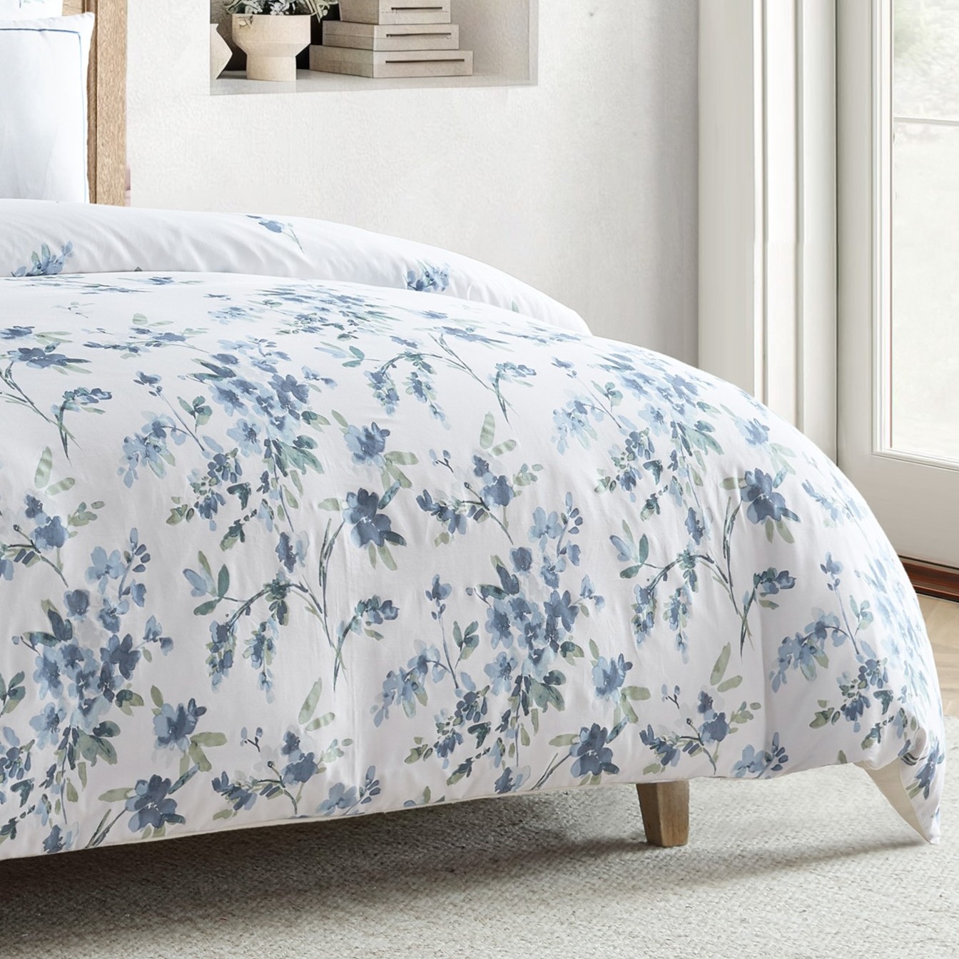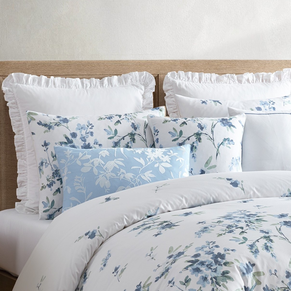 طقم مفرش سرير Cascade Blue القطني الفاخر 11 قطعة، بتصميم هادئ ومريح ليمنحك راحة ولمسة أنيقة لغرفة نومك.