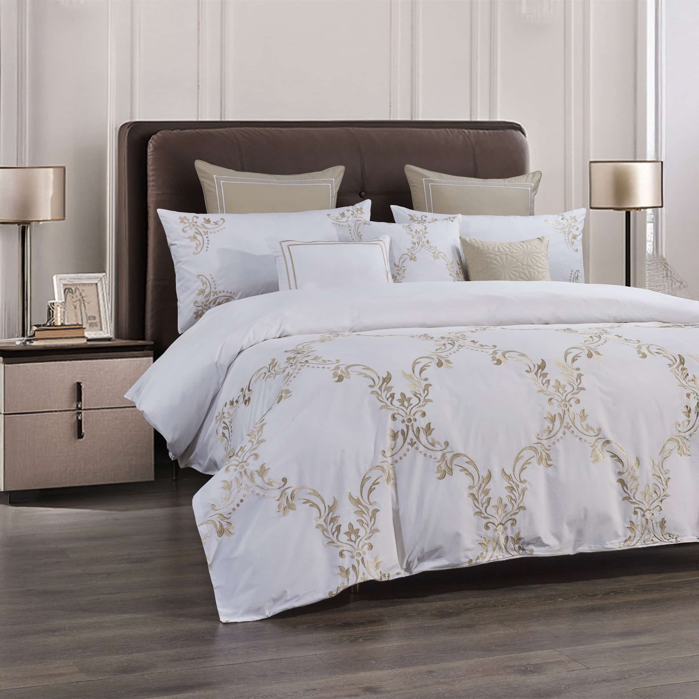 تصميمه الكلاسيكي الأنيق يزينه تطريز فاخرباللون الذهبي ومخدات ديكور مزخرفة تضفي لمسة ملكية ساحرة على سريرك.
