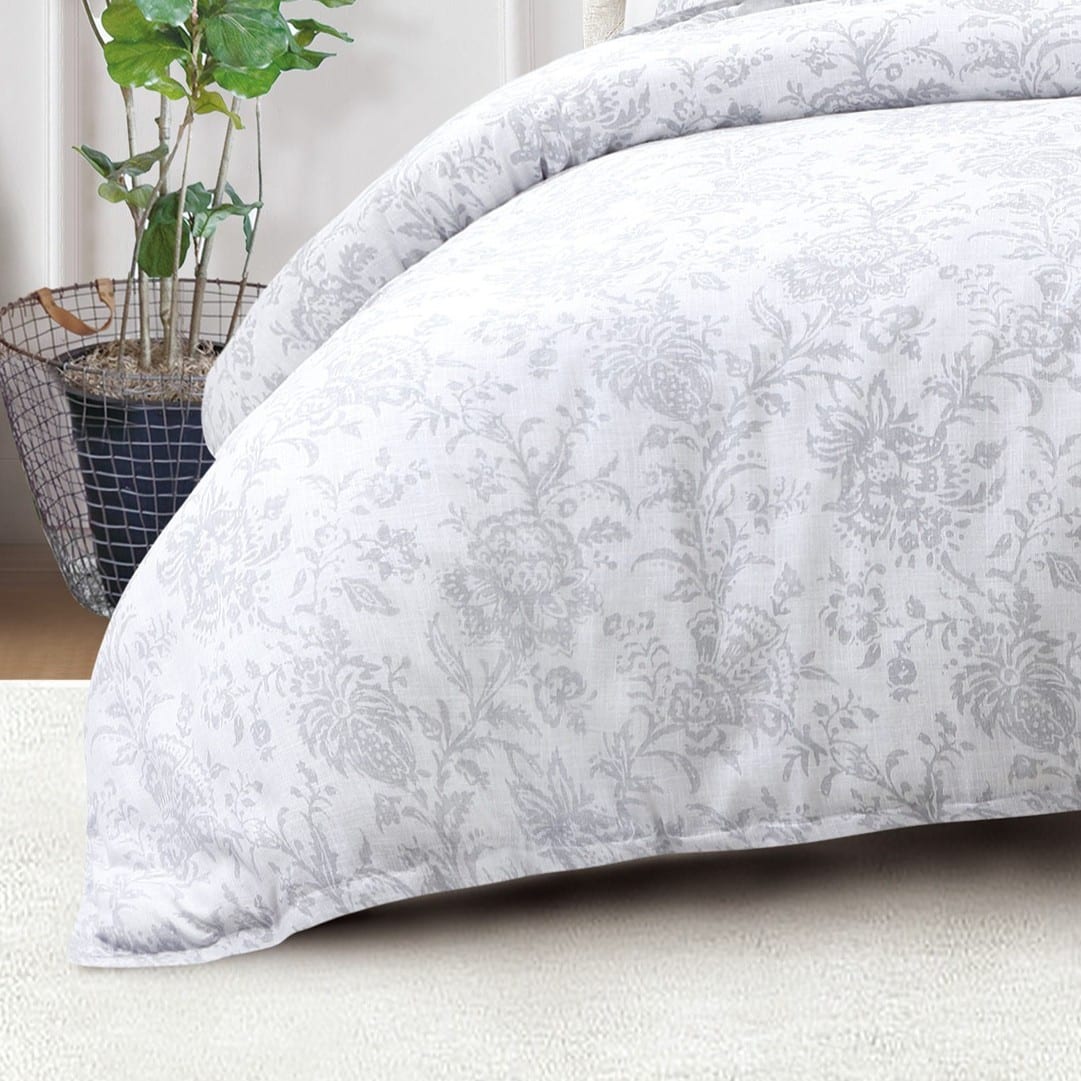 طقم لحاف سرير بنقشة أنيقة بلون أبيض مع تفاصيل رمادية ناعمة، يمنح غرفة نومك إحساسا بالهدوء والفخامة الراقية.