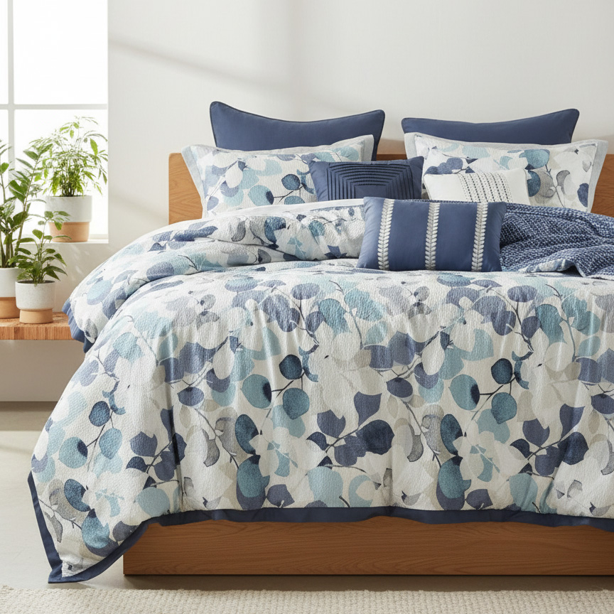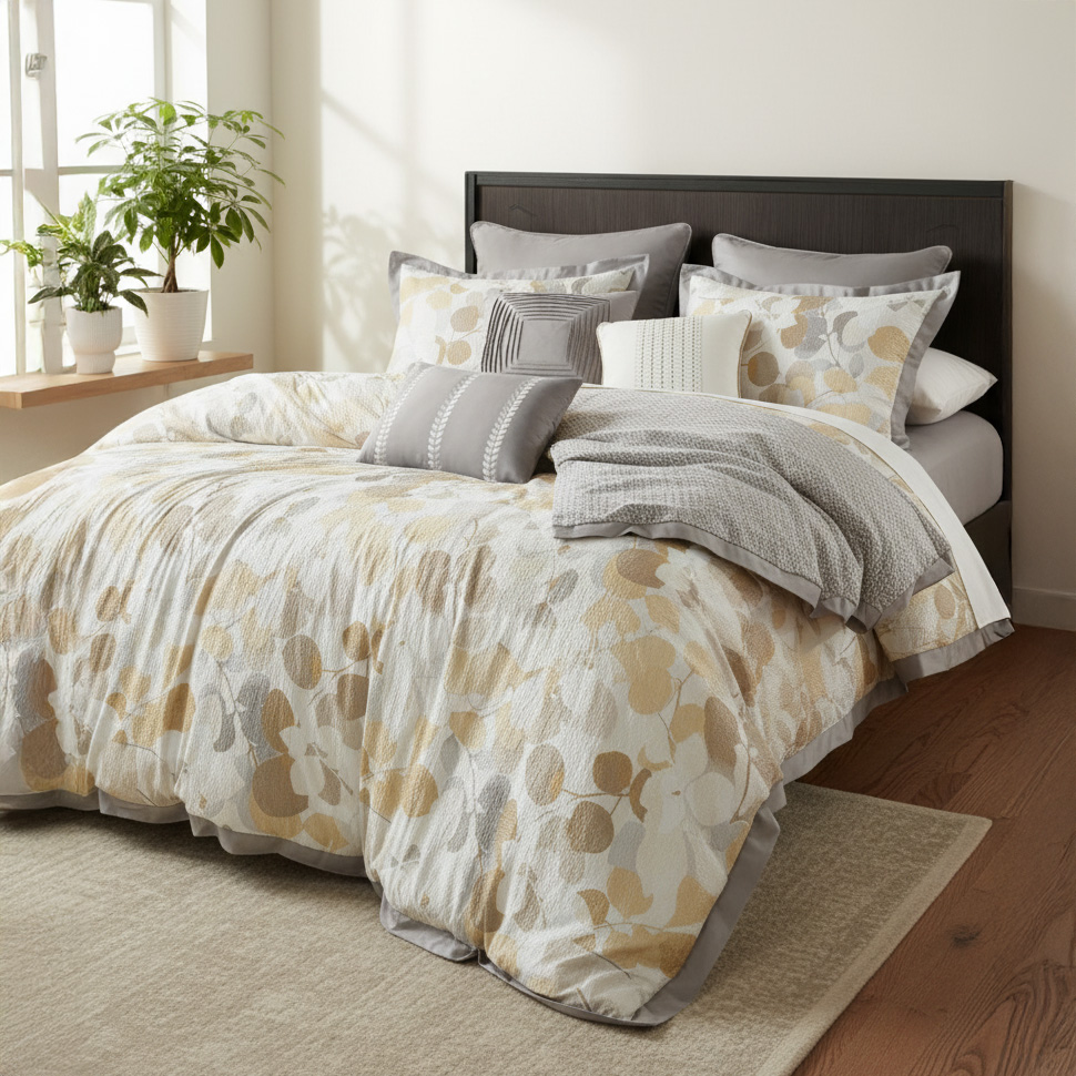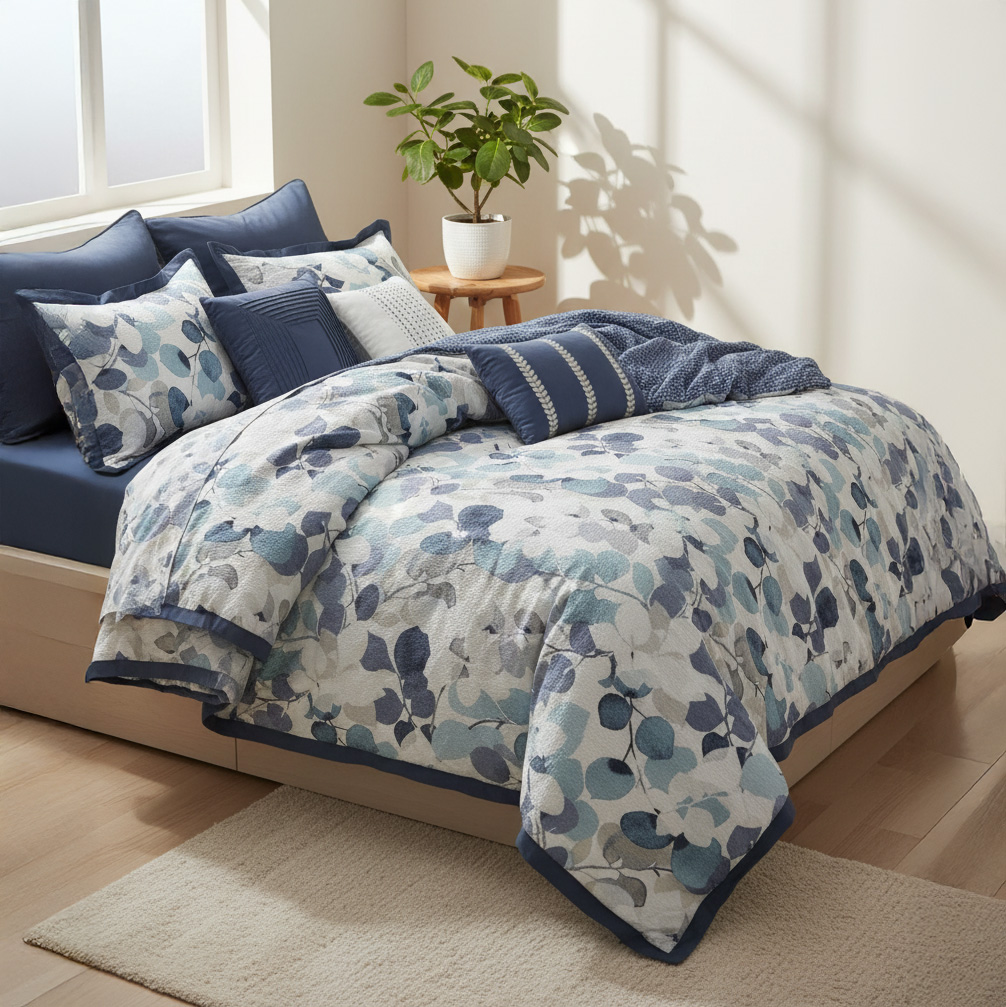 مفرش سرير بنقشة أوراق تضفي لمسة من الحيوية الراقية، مع خامة مايكروفايبر ناعمة تمنحك الراحة كل ليلة.