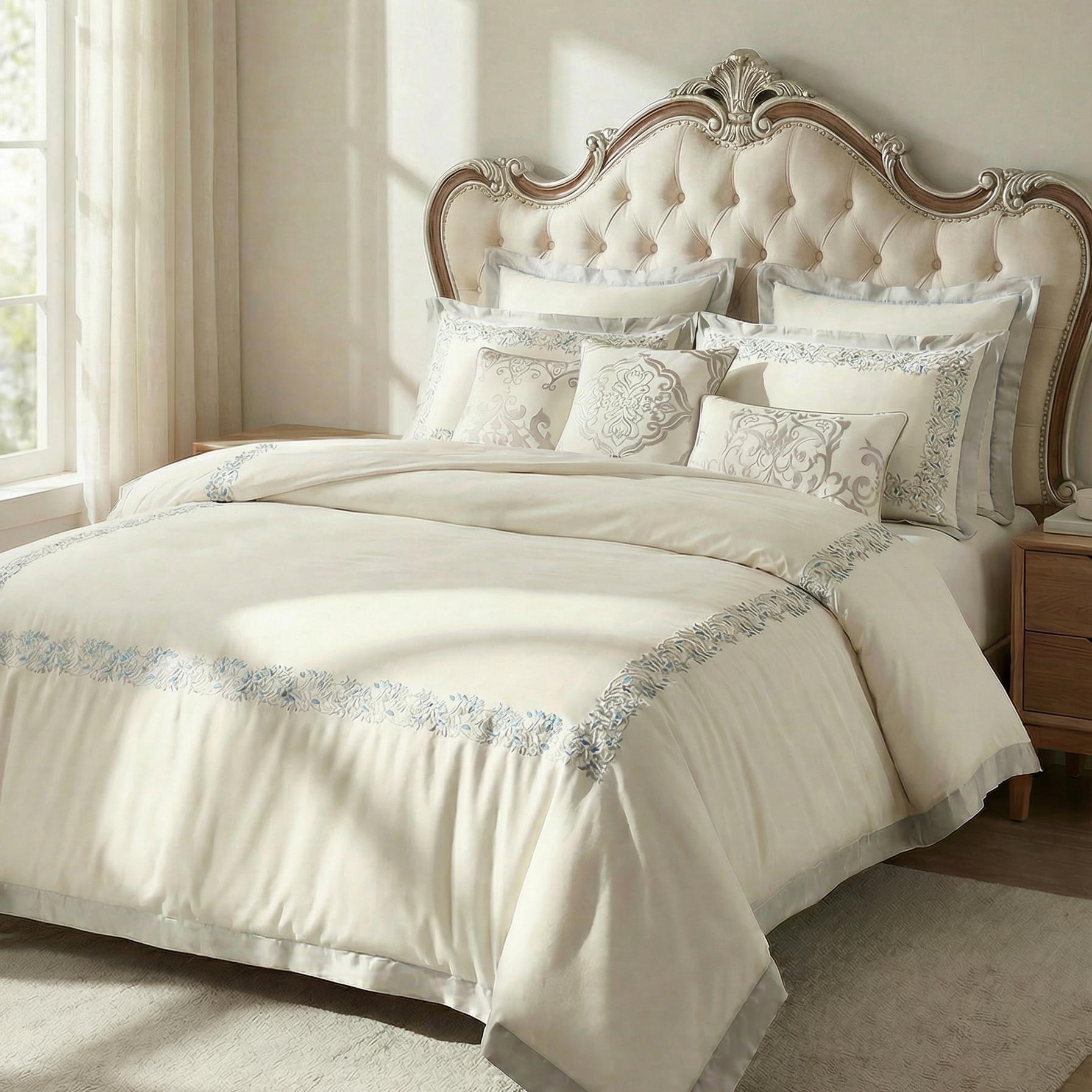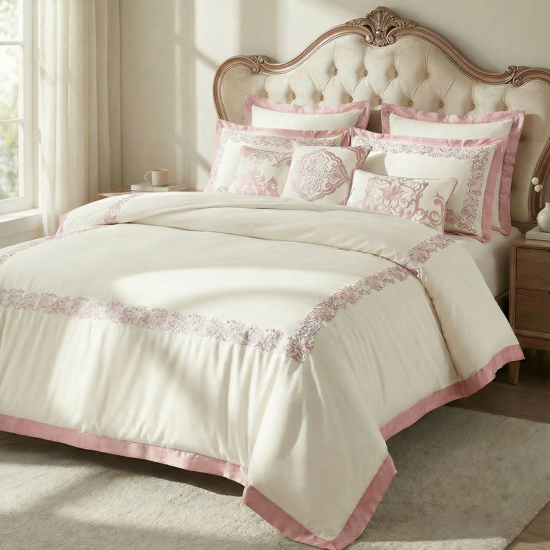 طقم مفرش فاخر من القطن الطبيعي بتطريز أنيق ولمسات بألوان راقية، يمنح غرفة نومك مظهراً ملكيا وراحة استثنائية.